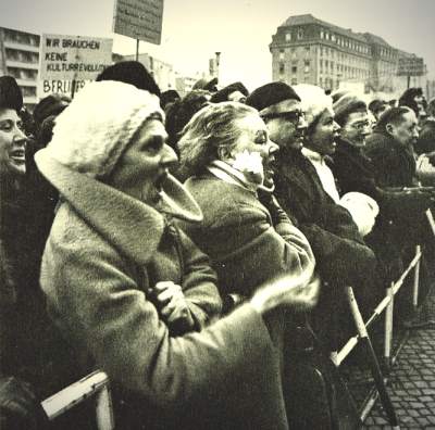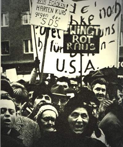 Der Berliner SPD-Landesvorsitzende Kurt Mattick sagt man müsse Verständnis für die Ungeduld der Jugend aufbringen. Jeder könne „an der demokratischen Entwicklung mitwirken". „Aber Unruhestifter und Randalierer, die unsere Freiheit zerstören wollen, sollen dahin gehen, wo sie hergekommen sind." Der CDU-Vorsitzende Franz Amrehn fordert einen „deutlichen Trennungsstrich" zwischen der Bevölkerung und „den revolutionären Kräften". Die Berliner stunden gegen ihre Gegner, die die Freiheit von innen her zu zerstören versuchten, wie eh und je zusammen. Als Amrehn erklärt, man habe es „satt, wenn einzelne Stadträte an Umzügen der Maoisten teilnehmen", werden Sprechchöre angestimmt „Ristock raus". Amrehn bezeichnet den Verwaltungsgerichtsbeschluß, der die Vietnam-Demonstration erlaubte, als „gespenstisch". Der Berliner DGB-Vorsitzende, Walter Sickert erklärt, die Berliner seien entschlossen, das zu verteidigen, was die Arbeitnehmer in den bitteren Zeiten des Aufbaus und der Not unter Einsatz aller Kräfte erarbeitet hätten. Als Sickert an die Zwischenfälle vor dem Untersuchungsausschuß vom Dienstag erinnert, kommt es zu Sprechchören „Dutschke raus". Der Regierende Bürgermeister Klaus Schütz spricht in seinem Beitrag den drei Schutzmächten das Vertrauen aus und erklärt, die Amerikaner seien zwar in Vietnam in einen tragischen Krieg verstrickt. In Berlin jedoch seien sie, um die Freiheit zu erhalten. Schütz setzt sich für eine politische Lösung in Vietnam ein. Wer das Sterben in Vietnam beenden wolle, dürfe nicht soviel von Haß und Krieg reden, wie es in Berlin am letzten Sonntag geschehen sei, sondern müsse Verständigung und Frieden fordern. Die Teilnehmer der Kundgebung tragen zahlreiche Transparente mit Aufschriften wie „Freiheit für die Zone", „Gegen Krieg wo auch immer", „Dutschke Volksfeind Nummer eins" „Dutschke raus aus West-Berlin", „Ristock und Beck — die müssen weg", „Tausche 10 Studenten gegen einen kleinen Flüchtling", „Dutschke, Kunzelmann über die Mauer", „Teufel in den Zoo", „für ein Verbot des SDS". Auf anderen Transparenten ist zu lesen: „Berlin bleibt frei mit starken Gewerkschaften", „Der Radikalismus ist der Tod unserer Stadt", „Frieden ist nur in Freiheit möglich", „Amerika garantiert die Sicherheit für Berlin". Der für die Kundgebung vorgesehene Redner der FDP, Hans-Günther Hoppe, tritt nicht auf, da dem Berliner FDP-Vorsitzenden William Born wegen seine Mitgliedschaft im Republikanischen Club die Unterzeichnung des Aufrufs zur Kundgebung von Politikern der SPD und CDU verwehrt worden war. Gegen Ende der Kundgebung kommt es in der Beiziger Straße wiederholt zu schweren Zwischenfällen, als Demonstranten junge Leute jagen und verprügeln. Ein Mann, den die Menge irrtümlich für Rudi Dutschke hält, wird verfolgt und muß von der Polizei zum eigenen Schütze in Gewahrsam genommen werden. Erst als etwa hundert Polizisten aufgeboten werden, kann die Menge von dem Fahrzeug, in dem der Mann Schutz gefunden hat, abgedrängt werden. Während des Vorfalls ertönen immer wieder Rufe wie „Lyncht ihn" und „Hängt ihn auf". Die Scheiben mehrerer Polizeifahrzeuge werden eingeschlagen, weil in ihnen junge Leute Zuflucht finden, die von den Demonstranten verfolgt wurden. Über 30 Personen werden während Zwischenfällen am Rande der Kundgebung zum Teil erheblich verletzt. 26 Personen werden zu ihrem eigenen Schutz von der Polizei festgenommen. Mehrere hundert Teilnehmer ziehen am Ende der Kundgebung vom John-F.-Kennedy-Platz in die Innenstadt. Ein Teil von ihnen versucht zum SDS-Haus zu gelangen, wird jedoch von der Polizei auf dem Kurfürstendamm abgedrängt. Quelle: Lönnendonker, Fichter, Staadt, Hochschule im Umbruch, Teil V, S.76 OCR-Scan red. trend |