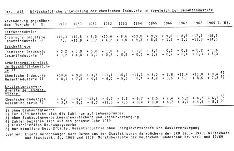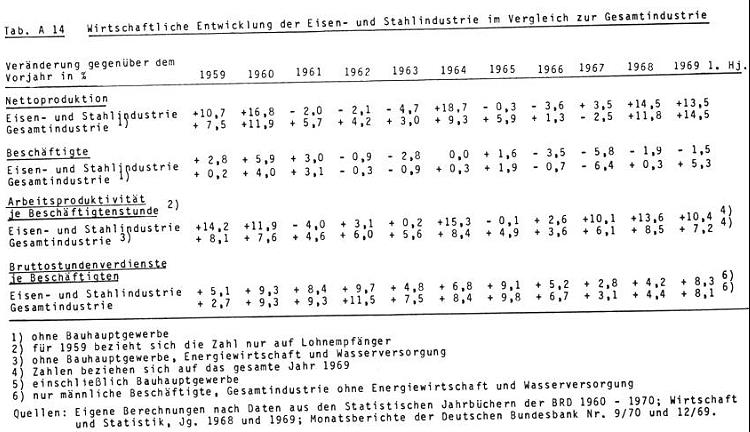 Kampfmaßnahmen dadurch erleichtert wurde. 2. Besondere Bedingungen der bestreikten Branchen Mit diesem Abschnitt wird beabsichtigt, anhand von Branchenanalysen zu untersuchen, inwieweit die branchenspezifische ökonomische Entwicklung der letzten Jahre eine Erklärung für die Konzentrierung der Streiks im September 1969 auf bestimmte Industriezweige - die Eisen- und Stahlindustrie sowie den Kohlenbergbau - liefern kann. Die Ausgangsfragestellung ist hierbei, ob sich in der ökonomischen Entwicklung dieser Branchen im Vergleich zur Gesamt industrie gravierende Differenzen ergeben, die als streikverursachende branchenspezifische Faktoren angesehen werden können. Zusätzlich soll erörtert werden, inwieweit sich die wirtschaftliche Lage in einer nicht bestreikten Branche der Chemieindustrie (23) - wesentlich von der in den bestreikten Branchen unterscheidet und insofern die genannte These stützt. a) Eisen- und Stahlindustrie Folgende Unterschiede gegenüber der Gesamtindustrie charakterisieren die Eisen- und Stahlindustrie als eine wachstumsschwache Branche: Von 1959 - 1968 war das Wachstum der Nettoproduktion