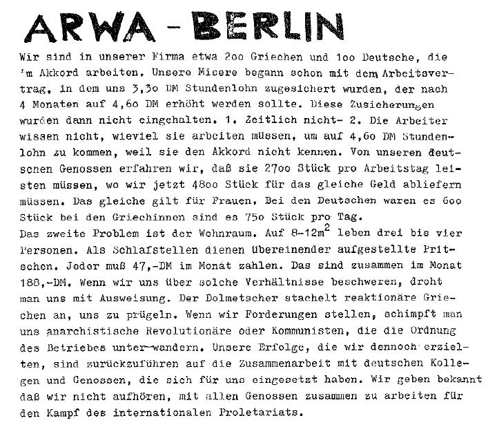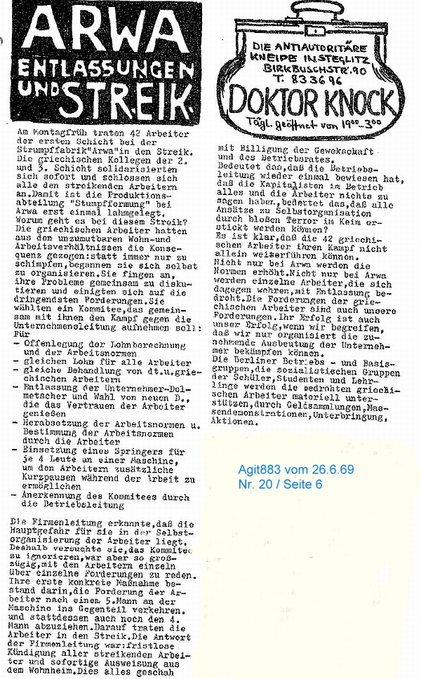 Wenige Monate vor den Septemberstreiks gab es am 23.6.1969 einen "wilden" Streik in Westberlin, der im linken Spektrum für Aufsehen sorgte. Laut MAO-Datenbank kam es am 26.6.1969 zu einer Soli-Demo für die seit dem 23.6.1969 streikenden Arwa-Arbeiter, an der sich ca. 3 000 deutsche und griechische Jugendliche beteiligten. Im Anschluß sollen noch 200 zum DGB-Haus gezogen sein.