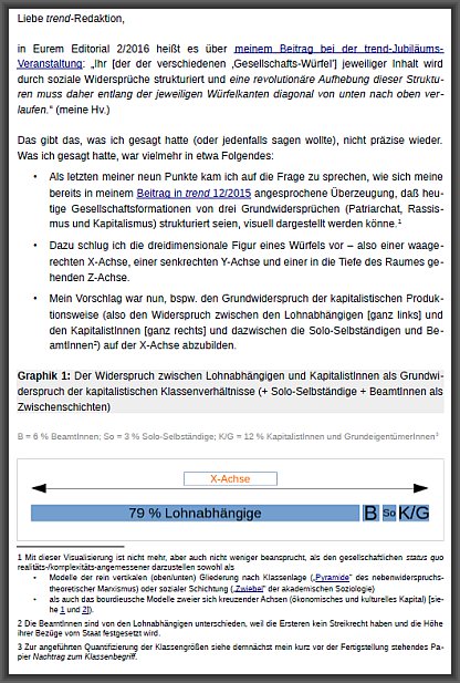 in Eurem Editorial 2/2016 heißt es über meinen Beitrag bei der trend-Jubiläums-Veranstaltung: „Ihr [der der verschiedenen ‚Gesellschafts-Würfel’] jeweiliger Inhalt wird durch soziale Widersprüche strukturiert und eine revolutionäre Aufhebung dieser Strukturen muss daher entlang der jeweiligen Würfelkanten diagonal von unten nach oben verlaufen.“ (meine Hv.)