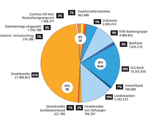 Neben dem geringen Gesellschaftskapital in Höhe von 25.000 Euro (pro Haus), bilden - wie obige Grafik deutlich macht - die Direktkredite das maßgebliche Eigenkapital der Hausbesitz-GmbHs.  Ursprünglich war das Eigenkapital in der Form von Direktkrediten dadurch gesichert, dass die Kreditgeber für die Laufzeit des Kredits Gesellschafter der Hausbesitz-GmbH wurden. Jedoch erlaubte das Kreditwesengesetz solch eine Finanzierung nur für maximal fünf Privatdarlehen. Der bis 1999 im Syndikat praktizierten Kreditaufnahme schob die Bundesanstalt für Finanzierungsdienstleistungsaufsicht dann mit der Rangrücktrittsklausel einen Riegel vor.(38)