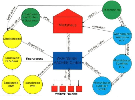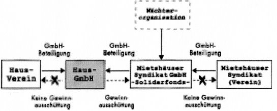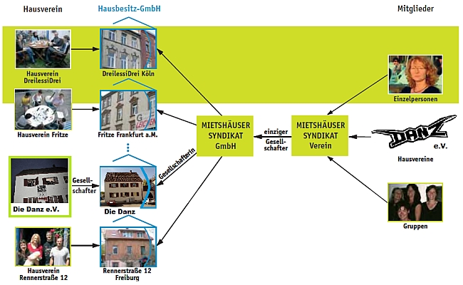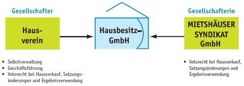 "Das Gesamtprojekt besteht aus dem Verein Mietshäuser Syndikat, der Mietshäuser Syndikat GmbH als geschäftliche Vertretung des Vereins, dem Solidarfonds und den jeweiligen Projekten, welche als GmbHs organisiert sind. Gesellschafter dieser Projekt-GmbHs sind die jeweiligen Hausvereine und die Mietshäuser Syndikat GmbH, welche über den Verein eine gemeinnützige Satzung in den Gesellschaftervertrag einbringt."(2)