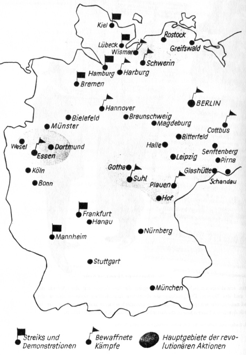 Ausdehnung des Generalstreiks auf ganz Deutschland. Insgesamt beteiligen sich rd. zwölf Mill. Arbeiter und Angestellte. In einer Reihe von Orten vereinbaren Organisationen der KPD, der USPD und der SPD gegen den Willen der rechten sozialdemokratischen Führer gemeinsame Aufrufe. Mitglieder der KPD, USPD und SPD, christliche und parteilose Arbeiter bilden Einheitsorgane, wie Streikleitungen, Aktionsausschüsse und Vollzugsräte. Der Streik legt tagelang Industrie, Verkehr und Nachrichtenwesen fast überall in Deutschland still. Er isoliert die Putschisten von ihren Hauptstützpunkten, den agrarischen Gebieten. Dem Kampf schließen sich viele Angehörige des Mittelstandes, der Intelligenz und des demokratischen Bürgertums an. Unter der Führung von Kommunisten und revolutionären Mitgl. der USPD gehen die Arbeiter in vielen Teilen Deutschlands zu bewaffneten Kämpfen über, so in Berlin, Leipzig, Mecklenburg, Mitteldeutschland, im Senf-tenberger Revier und in Thüringen.