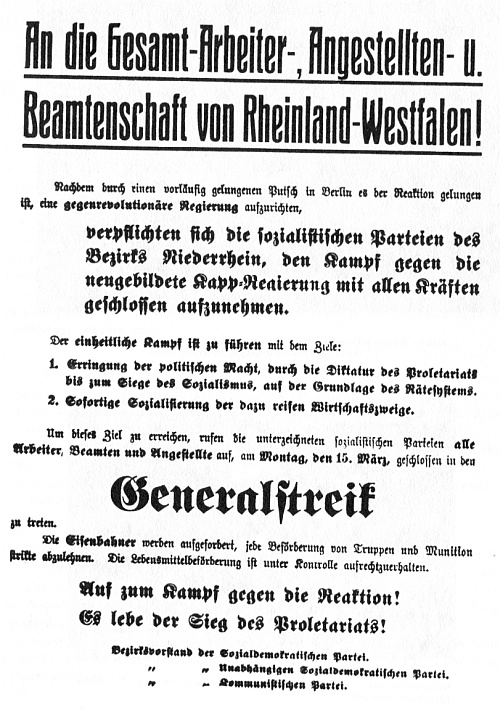 Die deutsche Arbeiterklasse beantwortet den Putsch mit machtvollen Abwehraktionen. Die durch den Opportunismus gespaltene Arbeiterklasse schließt sich angesichts der drohenden Gefahr zur Aktionseinheit zusammen. Die Führungen der SPD, der USPD, des ADGB und der Arbeitsgemeinschaft freier Angestelltenyerbände (AfA) rufen zum Generalstreik zur Verteidigung der bürgerlich-demokratischen Republik auf. Viele Organisationen der KPD, deren Mitgl. zusammen mit den revolutionären Kräften in der USPD in den vordersten Reihen der Kämpfenden stehen, rufen bereits am 13. März zum Generalstreik auf, fordern die Bewaffnung der Arbeiterklasse und die Bildung von AR. In der Zentrale der KPD kommt es zu Meinungsverschiedenheiten. Die in Berlin anwesenden Mitgl. der Zentrale beschließen am 13. März einen Aufruf, der die Notwendigkeit des Kampfes gegen die Militärdiktatur betont, den Kapp-Putsch aber lediglich als eine Auseinandersetzung innerhalb der herrschenden Klasse wertet. Die Arbeiterklasse sei infolge des Noske-Terrors in diesem Augenblick nicht aktionsfähig. Diese sektiererische Auffassung wird im Aufruf der Zentrale vom 14. März korrigiert, der den Generalstreik der Arbeiterklasse gegen die Putschisten unterstützt, den sofortigen Rücktritt der Kapp-Regierung, die Entwaffnung und Auflösung der konterrevolutionären Truppen, die Bildung von Arbeiterwehren und die Wahl von AR fordert. Der Aufruf wendet sich richtig gegen die Wiederkehr der Regierung Bauer.