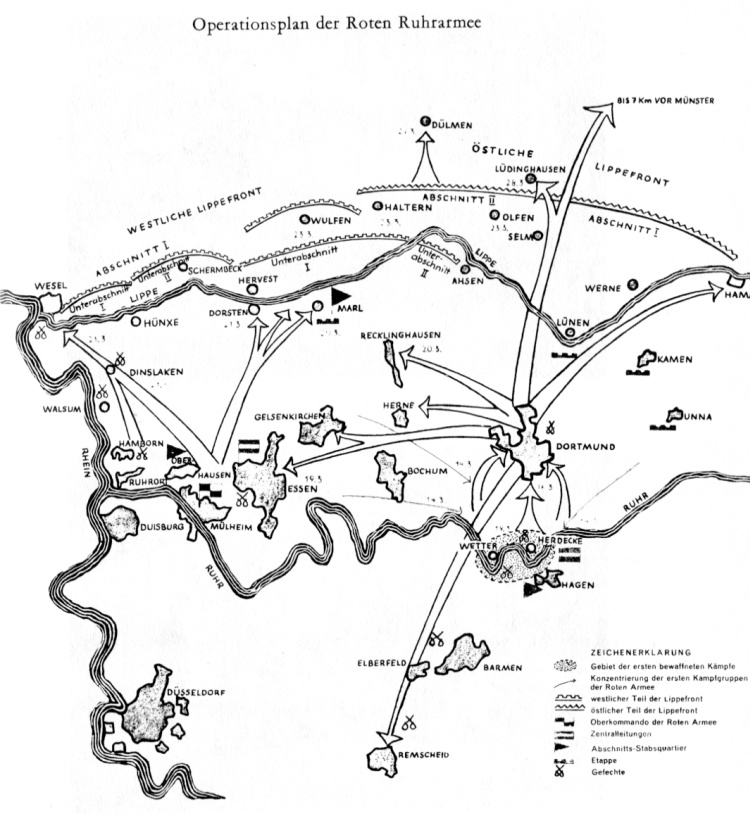 Ihren Höhepunkt erreichen die bewaffneten Aktionen im Ruhrgebiet. Am 15. März beginnt der Kampf der Roten Ruhrarmee gegen Freikorps, Reichswehr- und Polizeitruppen. In wenigen Tagen bauen die Ruhrarbeiter eine Armee von rd. 100 000 Mann auf, die mit Gewehren, MGs und Artillerie ausgerüstet ist. Bis 23. März ist fast das ganze Ruhrgebiet von konterrevolutionären Truppen gesäubert.