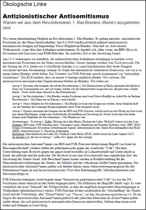 Wir waren jahrzehntelang Mitglied im Revolutionären 1. Mai-Bündnis. Es gelang meistens, antisemitische Positionen aus der Demo herauszuhalten. Am 6.4.2016 wurden plötzlich mehrere antizionistisch-antisemitische Gruppen auf fragwürdige Weise Mitglied im Bündnis. Man ließ sie, trotz unseres Widerspruchs, sogar über ihre Aufnahme mitabstimmen. Es handelt sich, allen voran, um BDS (Boycott, Divestment and Sanctions) und FOR-Palestine. Ihr zentrales Ziel ist die Zerstörung Israels. Am 13.4. beantragten wir mündlich, die undemokratischen Aufnahmen rückgängig zu machen sowie antisemitische Positionen aus der Demo auszuschließen. Unsere Anträge wurden vom Tisch gewischt. Für die Sitzung am 20.4. hatten wir 4 schriftliche Anträge (s.u.) samt Informationen über beide Gruppen verschickt und eine Abstimmung verlangt. Es folgte die antisemitisch verhetzteste Diskussion, wie wir je in einem linken Bündnis erlebt haben. Ein Vertreter von FOR-Palestine sprach zustimmend von "nationalem Sozialismus". Die RLB erklärte, dass sie unsere 4 Anträge inhaltlich ablehnt. Wir verloren. Die antizionistisch-antisemitischen Organisationen blieben im Bündnis. Wir traten aus.