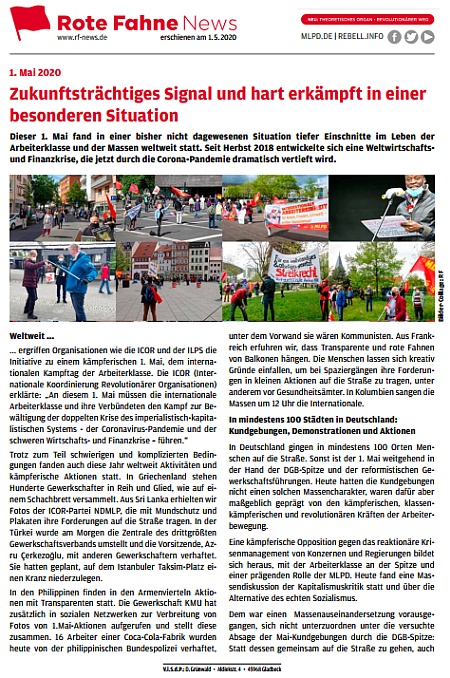 1. Mai 2020 Zukunftsträchtiges Signal und hart erkämpft in einer besonderen Situation Flugblatt der MLPD 05/2020 trend onlinezeitung Das komplette Flugblatt als PdF lesen