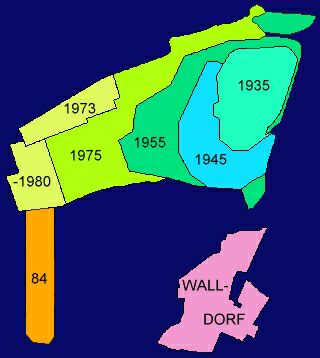 Zwischen diesem Gelände und dem Gelände das 1980 (hellgrün) angebaut wurde, verläuft die Okriftler Strasse.