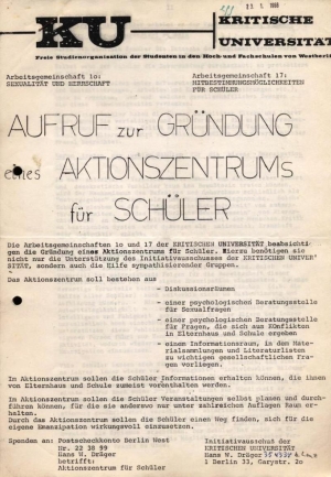 Im Januar 1968 rief dann die KU zur Gründung eines lokalen Aktionszentrums für Schüler*innen in Westberlin auf.