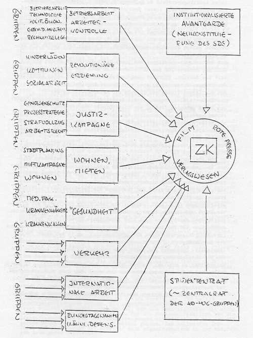 in einem "Org-Papier" des westberliner SDS, Sommer 1969Dieses additive Konzept erwies sich als Flop, denn die sogenannte Außerparlamentarische Opposition (APO) mit der Student*innenbewegung als sozialem Kern befand sich im Niedergang. Dieser Prozess war durch eine immense Zersplitterung gekennzeichnet, die ideologisch vom Provo-individual-Anarchismus bis zum revolutionären Kommunismus reichte.