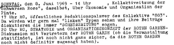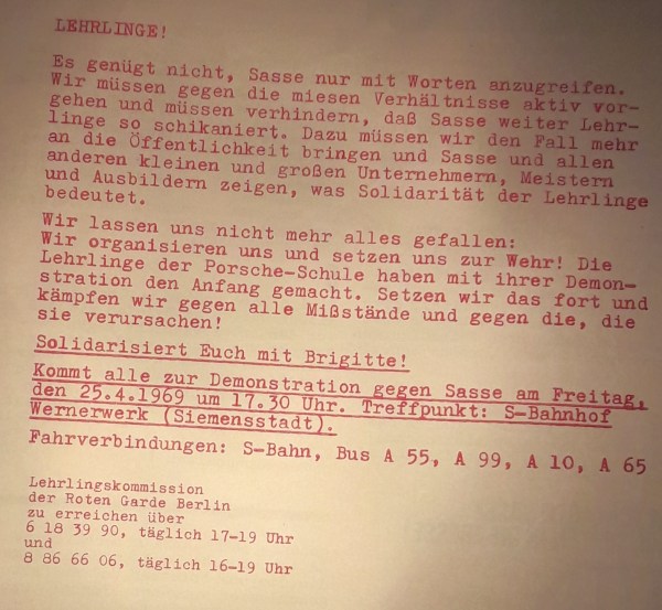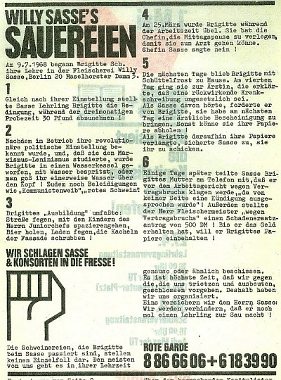 Das Buchhändler- und Verlegerkollektiv der Roten Garde Berlin gibt ein Flugblatt an die "Kolleginnen und Kollegen in Buchhandlungen und Verlagen!" heraus. Wegen der gekündigten Lehrlinge werden Interventionen auf Dichterlesungen beim Arbeitgeber Elwert & Meurer angekündigt.