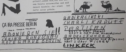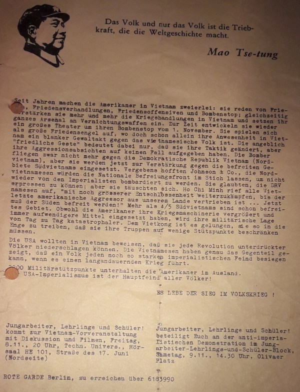 Die Schüler*innenzeitung "Radikalinski", die von Spandauer Schüler*nnen herausgegeben wird, erscheint erstmalig. In ihr wird über die Rote Garde berichtet. Verweise auf das maoistische Spektrum finden sich auch in der anarchistischen "Schülerzeitung" LINKECK.