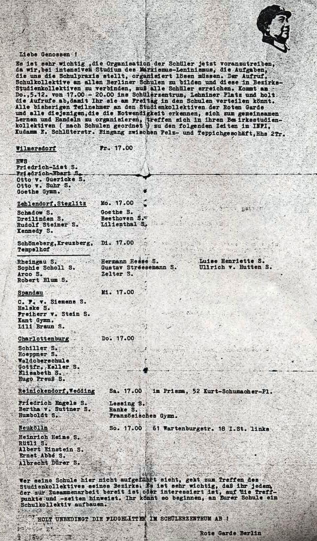 Die Rote Garde Berlin verbreitet ein Flugblatt "Mit dem ganzen Gerede gegen die Schülervereinigungen muß rasch Schluß gemacht werden".