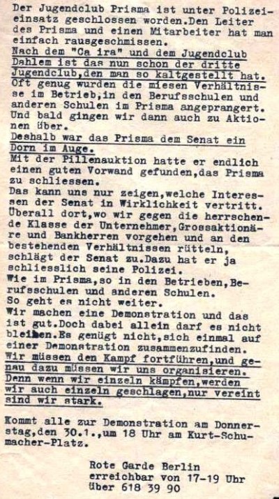 Der Jugendclub Prisma wird am 22.1.1969 wegen der dortigen Aktivitäten der Gruppe Sexpol durch das Bezirksamt geschlossen. Der Kampf gegen die Schließung wird von der Roten Garde unterstützt. Dazu gehört auch eine Demo, zu der für den 30.1. aufgerufen wird.