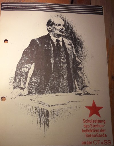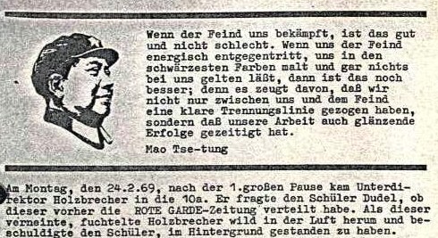Das Schulstudienkollektiv der Roten Garde am Friedrich-Engels-Gymnasium gibt ein Flugblatt heraus, in dem vom Besuch des Schuldirektors Holzbrecher in der Klasse 10a berichtet wird, bei dem nach Verteiler*innenn der Rote-Garde-Zeitung gesucht wurde.