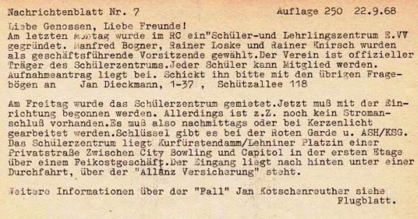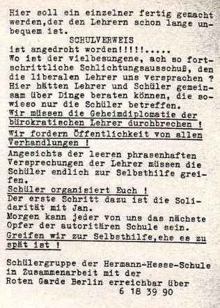 In Kreuzberg gibt die Schüler*innengruppe der Hermann-Hesse-Schule zusammen mit der Roten Garde zwei  Flugblätter zu den Repressalien gegen den Schüler Jan Kotschenreuther heraus.