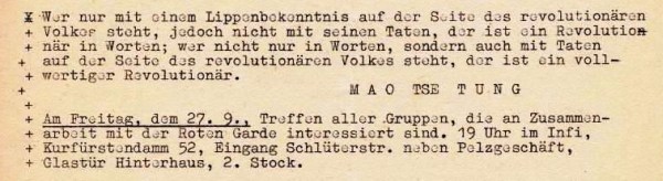 Rote Garde eine Solidaritätsadresse an die Tschechoslowakische revolutionäre Jugend und tritt erstmals öffentlich als politische Organisation in Erscheinung.