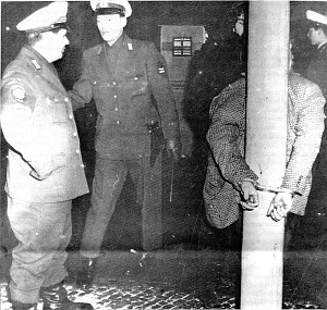 Diese Fotos wurden Weihnachten 1968 aufgenommen und erst jetzt zugänglich. Sie entstanden bei der Räumung der ehemaligen Chinesischen Botschaft am Kurfürstendamm 219 durch die Polizei: Fünf Demonstranten waren morgens in die Botschaft gegangen und hatten sie besetzt - zu Ehren des Mao-Geburtstages. Das Besitzrecht am Haus ist umstritten,die Regierungen auf Formosa und in Peking erheben Anspruch darauf. Juristen sind der Meinung, daß selbst bei ungeklärtem Besitz der diplomatische Status einer Botschaft, die Exterritorialität, gewahrt bleiben muß. In einem Verfahren vor dem Verwaltungsgericht wird deshalb geklärt werden, ob der Einsatz der Polizei unrechtmäßig war. Geklärt werden soll in einem Strafverfahren auch das Verhalten der Polizisten. Einer der Demonstranten wurde an einen Laternenpfahl vor dem Haus gebunden. Er erhielt in gefesseltem Zustand einen Schlag in den Magen.  Das Foto rechts zeigt, wie der Mann nach dem Schlag zusammenknickt.