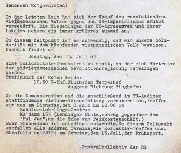 Zu einer vom SDS initiierten antiimperialistischen Demo machen die Roten Garden in der TU eine Infoveranstaltung und rufen zu einem eigenen Block auf.