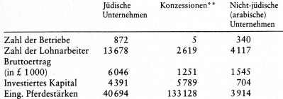 Um 1880 herum sind die einzigen Industrieunternehmen von Palästina die Seifenfabriken von Nablus, einige Mühlen und rückständige Handwerksbetriebe. Durch den Antrieb der zionistischen Kolonisierung erwacht das Land aus seiner Erstarrung: die Exporte im Hafen von Jaffa erreichen 1900 264000 £ und 1911 682000 £. [33] 1918 zählt man etwa 1230 Betriebe, in denen mindestens vier Lohnarbeiter angestellt sind. Das arabische Handwerk spielt dort noch eine große Rolle, ebenso wie die deutschen Siedler, die übrigens eine eigene Bank gegründet haben: die Bank der Tempelgesellschaft. Zu dieser Zeit ist man sich einig in der Annahme, daß die Industrie in Palästina keine Zukunft hat. Und in der Tat läßt sich die Industrialisierung des Landes nur erklären, durch die zionistische Politik. [34]