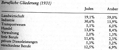 Von den 212000 jüdischen Arbeitern Palästinas im Jahre 1943 sind 28,8% in der Industrie und im Handwerk beschäftigt. Die arabischen Lohnarbeiter im industriellen Sektor erreichen zu dieser Zeit die Zahl von 21000. [3] Ein Vergleich der beruflichen Gliederung der arbeitsfähigen Bevölkerung zeigt die industrielle Orientierung der jüdischen Gemeinschaft und die landwirtschaftliche Gliederung der arabischen Gesellschaft. [4]