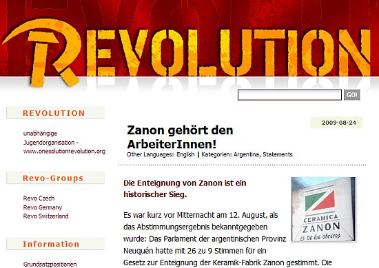 onlinezeitungEs war kurz vor Mitternacht am 12. August, als das Abstimmungsergebnis bekanntgegeben wurde: Das Parlament der argentinischen Provinz Neuquén hatte mit 26 zu 9 Stimmen für ein Gesetz zur Enteignung der Keramik-Fabrik Zanon gestimmt. Die Gebäude, Maschinen und auch die Marke “Zanon” gehören nicht mehr dem Kapitalisten Luigi Zanon - sie gehören der GenossInnenschaft FaSinPat (”Fabrica Sin Patrones”, Fabrik Ohne BesitzerInnen).
