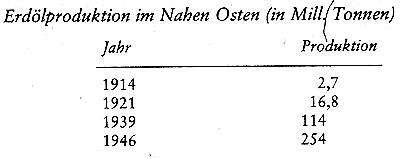 Aber die arabische Welt ist natürlich eine außergewöhnliche Vorratsquelle für Rohstoffe, im besonderen Erdöl. Diese Bodenschätze, schon seit Beginn des 20. Jahrhundert begehrtes Objekt der Großmächte, erhalten während des 2. Weltkrieges verstärkte Bedeutung. )ie weitere Entdeckung von Erdöllagern zwischen den beiden Welt-Siegen läßt den Nahen Osten eine wachsende Rolle innerhalb der Erdölproduktion der Welt einnehmen. [11]