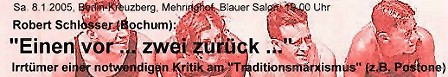 Auf Einladung der trend-Redaktion referiert Robert Schlosser (Bochum) am Sa. 8.1.2005, Berlin-Kreuzberg, Mehringhof, Blauer Salon, 19.00 Uhr.Dabei geht es um: Das Scheitern des Sozialismus in Theorie und Praxis - Ein etwas differenzierter Blick in die Schublade des "Traditionsmarxismus" - Wert und Kapital als soziale Beziehungen zwischen Menschen - Anmerkungen zur Mode der Ontologie-Kritik - Befreiung von Arbeit und Befreiung der Arbeit oder wie sich manche Theorien selbst dementieren.