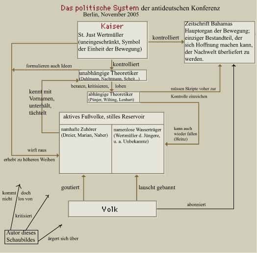 Es ist irgendwie ganz lustig, dass jedes Mal, wenn man die Antideutschen kritisieren will, sie sich immer ganz furchtbar differenziert geben. Auf einmal gibt es “die” Antideutschen gar nicht mehr. Komischerweise war von dieser Differenzierung bei den antideutschen Wortmeldungen, die auf der Veranstaltung “Rechtspopulismus und die Linke” am Samstag getätigt wurden, in der Realität überhaupt nichts zu spüren. Der offene Kulturrassismus gegenüber Muslimen, die latente Befürwortung imperialistischer Kriege und die aggressive Apologie der israelischen Besatzungspolitik mit Hinweis auf den Antisemitismus “der Araber” waren der Tenor nahezu aller Beiträge aus dieser Hälfte des Publikums. Ich kann daraus nur eines schließen: Entweder äußert sich in der Öffentlichkeit regelmäßig nur eine Fraktionierung der Antideutschen zu Wort, während die andere ziemlich konsequent schweigt, oder es ist immer noch so furchtbar einfach, wie es vor sechs Jahren war, als ein kritisches Mitglied der Bewegung (und kaiserkritisch sind sie ja fast alle) dieses schöne Schaubild erstellte: