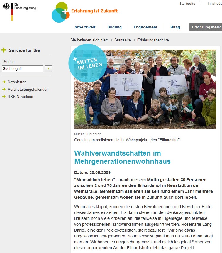 Neustadt an der Weinstraße: Interessenten gesuchtDer Eilhardshof, das Generationen übergreifende Wohnprojekt in einer Jugendstil-Villa am Rande von Neustadt/Weinstraße, das aus einer Initiative von Horst Stowasser und den Menschen aus seinem Umfeld entstanden war, ist gescheitert. Angesichts der drastisch gestiegenen Baukosten und der daraus folgenden finanziellen Probleme, ist die Gruppe nicht mehr in der Lage, den Bau zu finanzieren. Das Gebäude muss verkauft werden. Interessenten, die die Idee vom gemeinschaftlichen Wohnen auf der Basis gegenseitiger Hilfe und Solidarität weiter führen wollen, werden gesucht. So weit die nackten Tatsachen.