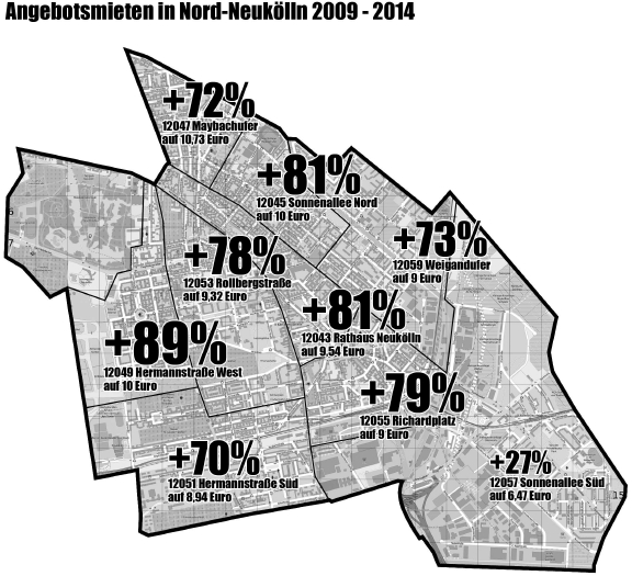 An dieser Stelle muss hervorgehoben werden, dass damit wahrscheinlich 2017- also im ersten Jahr nach Inkrafttreten des GE - ca.121.000 Sozialwohnungen in den Genuß einer gedeckelten Miete kämen, während die restlichen 1,9 Millionen Mietwohnungen unberührt von diesem GE weiterhin uneingeschränkt dem kapitalistischen Marktgeschehen ausgesetzt bleiben(5). Welche Preissprünge auch dann in gefragten Berliner Altbaugebieten zu erwarten sind, illustriert die nachfolgende Grafik, die vom Blog http://nk44.blogsport.de/ übernommen wurde.